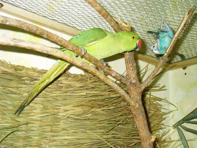 Nachtrag: Halsbandsittiche können nicht problemlos mit kleineren Arten zusammen gehalten werden. Die oben gezeigten Wellensittiche und Nymphensittiche haben inzwischen eine eigene Voliere bezogen.. |