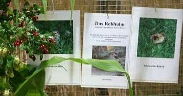 In dieser Voliere, die den Besucher gleich am Anfang der Ausstellung empfing, wurde eine Rebhuhngruppe von ca. 25 Tieren gezeigt, die alle aus Nachzuchten stammen. Dort fand sich auch eine genaue Beschreibung des Lebensraums und der Verhaltensweisen dieser Vogelart, welche seit über 20 Jahren in der Gemeinde Wals nicht mehr zu beobachten ist.