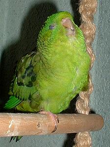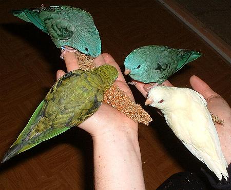 Das obige Bild zeigt noch eine weitere Eigenschaft des Katharinasittichs - seine Zutraulichkeit. Mit ein wenig Geduld und Ausdauer (man muss eben nur einen größeren Dickkopf haben als der Katharinasittich ;-) ) ist es keine Kunst, Katharinasittiche auch im Schwarm handzahm zu bekommen. Ein hervorragendes Hilfsmittel für derartige Bemühungen ist natürlich die Kolbenhirse. |