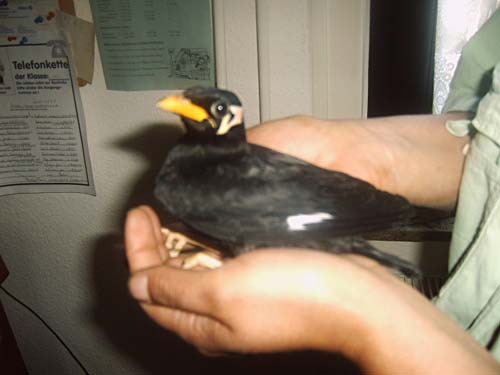 Angefangen hatte alles mit Samy, den ich vor etwa 8 Jahren auf einer Geflügelbörse kaufte. Der damals etwa zweijährige Vogel hatte sofort mein Herz erobert, obwohl er eigentlich nur sehr wenig spricht. Samy ist anderen Menschen gegenüber sehr aggressiv, lässt sich nur von mir füttern und greift auch mal andere Personen an. Etwa ein halbes Jahr später überlegten wir uns, dass Samy einen Partner braucht und kauften einen Beo aus zweiter Hand. Als Tony zu uns kam, Alter und Geschlecht unbekannt, bewohnte Samy eine große Voliere im Garten. Nachdem die beiden sich vom Sehen kannten und in einem neutralen Käfig zusammen kamen, griffen sie sich sofort an und alle weiteren Versuche, die beiden zusammenzubringen scheiterten. Schweren Herzens gaben wir Tony an einen Tierpark, wo er heute noch mit anderen Beos friedlich zusammen lebt. |