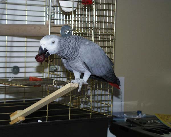 namens Odin schaut mich frech an. Ein etwas größeres Graupapageienweibchen